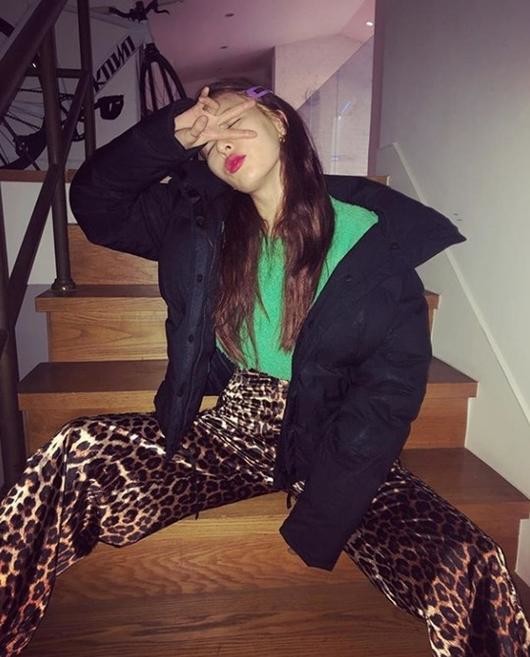 현아는 블랙 숏 패딩에 초록색 니트, 레오파드 무늬 와이드 팬츠 등을 레이어드해 한껏 패션 센스를 뽐내고 있다. 특히 보라색 똑딱핀까지 완벽한 패션을 자랑하고 있어 눈길을 끈다.