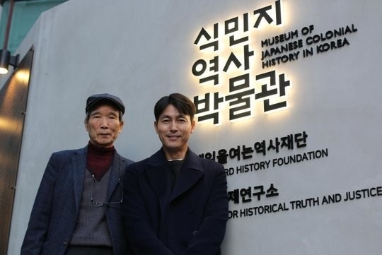 공개된 사진 속 정우성은 식민지역사박물관 앞에서 임헌영 소장과 포즈를 취하고 있다.