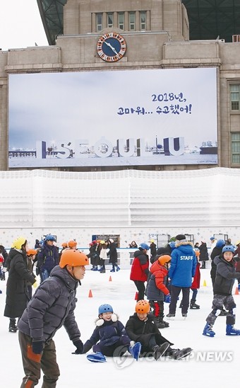 성탄절인 25일 오전 서울광장 스케이트장을 찾은 어린이들이 스케이트를 즐기고 있다. 미세먼지 공습에 개장 하루 만에 문을 닫았던 서울광장 스케이트장은 이날 미세먼지가 걷히자 성탄절 휴일을 즐기려는 어린이를 동반한 가족 단위 방문객으로 오전부터 북적였다.