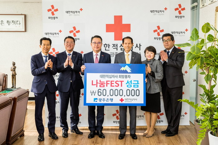 [시민일보=고수현 기자]광주은행(은행장 송종욱)은 24일 오전 10시 매곡동 대한적십자사 광주전남지사에서 ‘희망풍차 나눔FEST 캠페인’에 성금 전달식을 가지고 6천만원을 전달했다고 밝혔다.