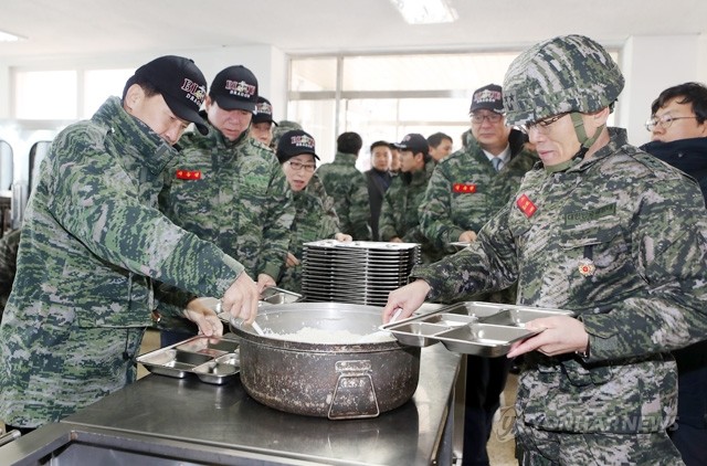 바른미래당 손학규 대표 26일 오전 경기도 김포시 월곶면 해병 2사단 청룡부대를 방문해 해병대원들과 점심식사를 하고자 밥을 뜨고 있다.