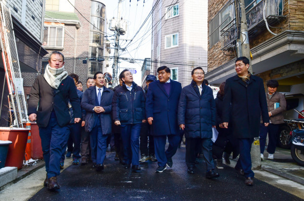 | ▲ 중화동 도시재생 희망지를 방문한 류경기 구청장, 박원순 시장, 박홍근 국회의원 등이 현장을 살펴보고 있다. | ||