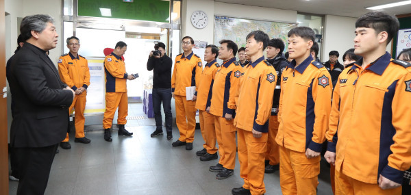 그는 격려품을 전달한 뒤 소방대원들과 간담회를 하고 현장 애로사항을 청취했다. 특히 지난 11월30일 오후 수원에서 발생한 ‘골든프라자’ 화재사고와 관련해 보고받고 철저한 재해 예방과 안전 확보를 당부했다.