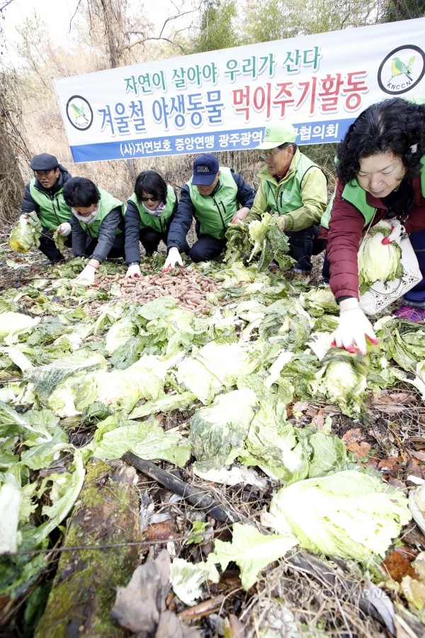 26일 오전 광주광역시 북구 생룡동의 야산에서 북구청 환경과 직원들과 자연보호중앙연맹 북구협의회원들이 겨울철 먹이를 찾지 못한 야생동물을 위해 배추와 고구마 등을 뿌려주고 있다.