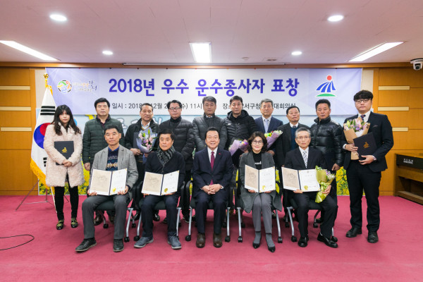 강서구는 26일 오전 11시 구청 3층 대회의실에서 우수 운수종사자 15명에게 표창장을 수여했다. 이날 표창대상은 택시 8명, 버스 3명, 자동차관리사업 4명 등 운수분야 종사자 15명이 선정됐다. 사진은 노현송 구청장(앞줄 가운데)이 우수 운수종사자들과 기념촬영을 하는 모습. (사진제공=강서구청)