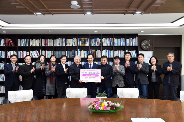 경기 의정부예술의전당은 27일 지역내 저소득가정을 돕기 위한 성금 242만5000원을 의정부시 이웃돕기 창구에 기탁했다. 사진은 안병용 시장 및 의정부예술의전당 관계자들이 기념촬영을 하는 모습. (사진제공=의정부시청)