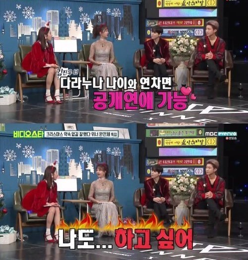 그러자 산다라박은 "공개연애 나도... 하고 싶어", 김진우는 "원해 그걸"이라는 반응을 보였다.