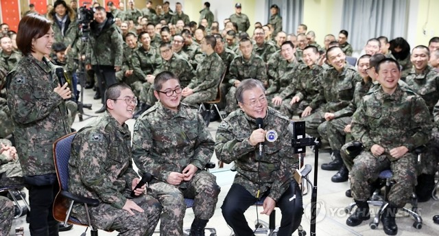 문재인 대통령이 28일 경기도 연천 육군 5사단 신병교육대대를 방문해 쌍둥이 동반입대자인 김태훈, 김태호 훈련병의 모친 및 친형과 영상통화를 하고 있다.