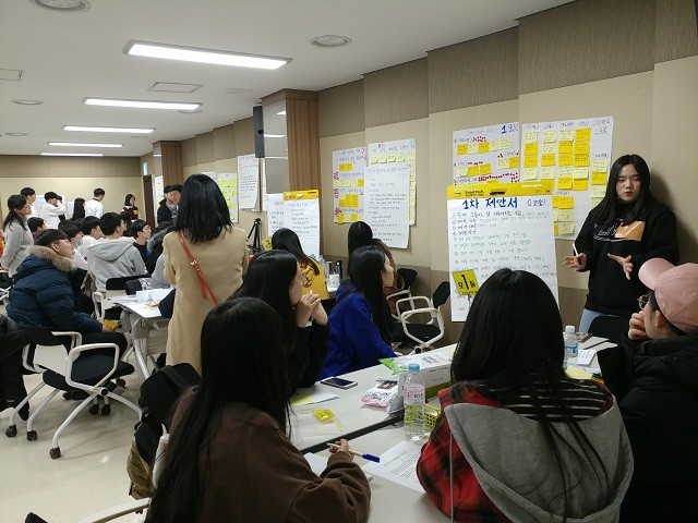 이날 토론에 참가한 고등학생 70여 명은 말이 아닌 글로 표현하기(브레인라이팅 Brainwriting)를 통해 ‘내가 바라는 행복한 학교’에 대해 서로의 생각을 듣고 의견을 나누며 모둠별로 주제를 선정해 1차 제안서를 작성했다.