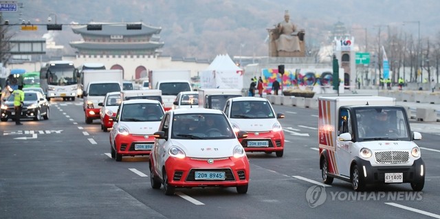 2일 오전 서울 광화문 세종대로에서 집배원들이 올해부터 도입되는 초소형 전기차를 타고서 2019 희망배달 집배원 안전다짐 전기차 퍼레이드를 하고 있다.