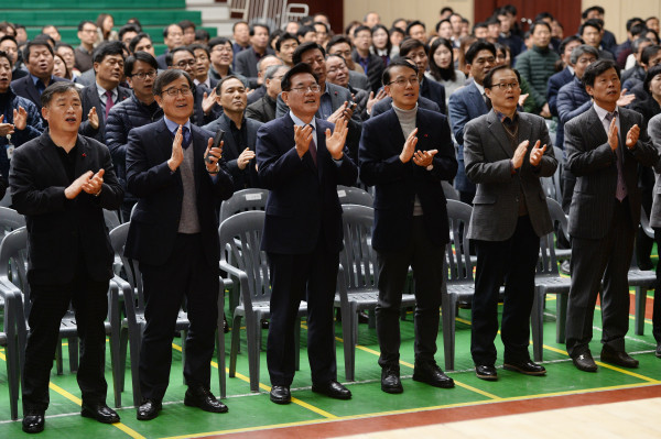 2일 동대문구가 구청 다목적강당에서 시무식을 열고 올해 공식 업무를 시작했다. 사진은 유덕열 구청장(왼쪽 세 번째)이 직원들과 함께 ‘희망의 나라로’를 합창하고 있는 모습. (사진제공=동대문구청)