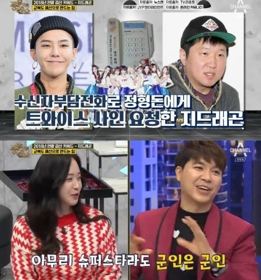 이날 연예부 기자는 "최근 한 방송에서 정현돈이 지드래곤과의 일화를 알렸다. 지드래곤이 정현돈에게 수신자부담 전화로 전화해 트와이스의 사인을 요청했다고 하더라"고 밝혀 웃음을 자아냈다.