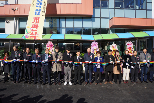전남 완도군 완도중학교는 3일 오전 10시30분 신우철 군수, 조숙희 완도교육지원청장 등 각계 인사, 학부모, 학생들이 참여한 가운데 급식실 및 시청각실 개관식을 가졌다. 사진은 참여자들이 축하 테이프 커팅을 하고 있는 모습. (사진제공=완도군청)