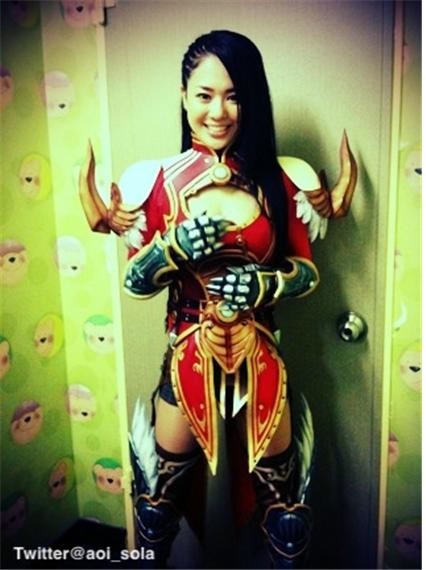 아오이 소라는 과거 "게임 캐릭터의 코스프레. 퀄리티가 높다"라며 한 장의 사진을 공개했다. 방에서 찍은 듯 한 사진 속 아오이 소라는 게임 '드라고나' 속 캐릭터 의상을 착용하고 환하게 웃고 있다.