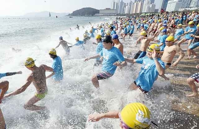 6일 부산 해운대해수욕장에서 열린 ‘해운대 북극곰 축제’에서 국내외 참가자 4천여 명이 수영복 차림으로 차가운 겨울 바다에 뛰어들고 있다.