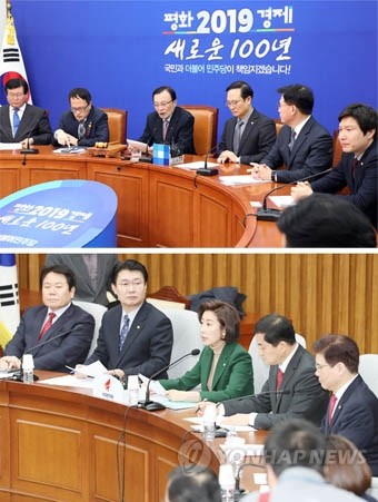 더불어민주당 이해찬 대표가 4일 국회에서 열린 최고위원회의에서 발언하고 있다(위). 자유한국당 나경원 원내대표가 4일 오전 국회에서 열린 ‘원내대책위-KBS의 헌법파괴 저지 및 수신료 분리징수 특위 연석회의’에서 발언하고 있다.