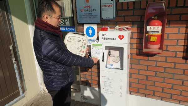 경기 여주시는 최근 지역내 전통시장 2곳에 자동심장충격기 2개를 설치 완료했다. 자동심장충격기는 심장정지와 같은 위급상황에서 전기충격으로 심장기능을 회복하도록 돕는 구급장비다. 사진은 구 관계자가 자동심장충격기를 설치하는 모습. (사진제공=여주시청)