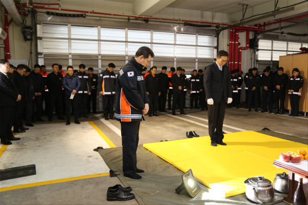 종로소방서는 지난 4일 2019년 황금돼지해인 기해년을 맞아 소방서 1층 차고에서 각종 재난현장에서 직원들이 안전사고 없는 한 해가 되기를 염원하는 안전기원제를 올렸다. 사진은 권혁민 서장 및 참여자들이 제례를 올리고 있는 모습. (사진제공=종로소방서)