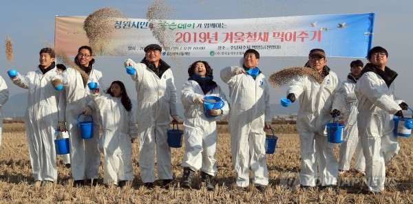 6일 경남 창원시 의창구 주남저수지에서 무학좋은데이나눔재단과 한국습지보호협회 주관으로 열린 '겨울철 철새 먹이 나누기' 행사에서 참석자들이 볍씨를 뿌리고 있다.