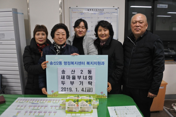 경기 의정부시 송산2동 새마을부녀회는 최근 동 행정복지센터 복지지원과를 방문해 지역내 어려운 이웃들에게 전해달라며 두부 140모를 기탁했다. 사진은 동 행정복지센터를 방문한 새마을부녀회원들이 기탁을 기념해 기념촬영을 하는 모습. (사진제공=의정부시청)