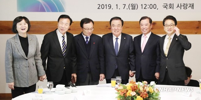 문희상 국회의장과 각당 대표들이 7일 국회 사랑재에서 열린 국회의장 주최 초월회 오찬 행사에서 기념사진을 촬영하기 위해 자리를 잡고 있다. 왼쪽부터 정의당 이정미, 바른미래당 손학규, 더불어민주당 이해찬 대표, 문 의장, 자유한국당 김병준 비상대책위원장, 민주평화당 정동영 대표.