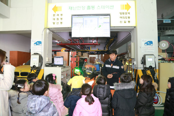 영등포소방서는 7일 오전 여의도 소재 LG사랑어린이집 어린이들을 대상으로 눈높이 소방안전교육을 실시했다. 사진은 소방서 관계자가 어린이들에게 재난 현장 출동 스테이션에 대해 설명하고 있는 모습. (사진제공=영등포소방서)