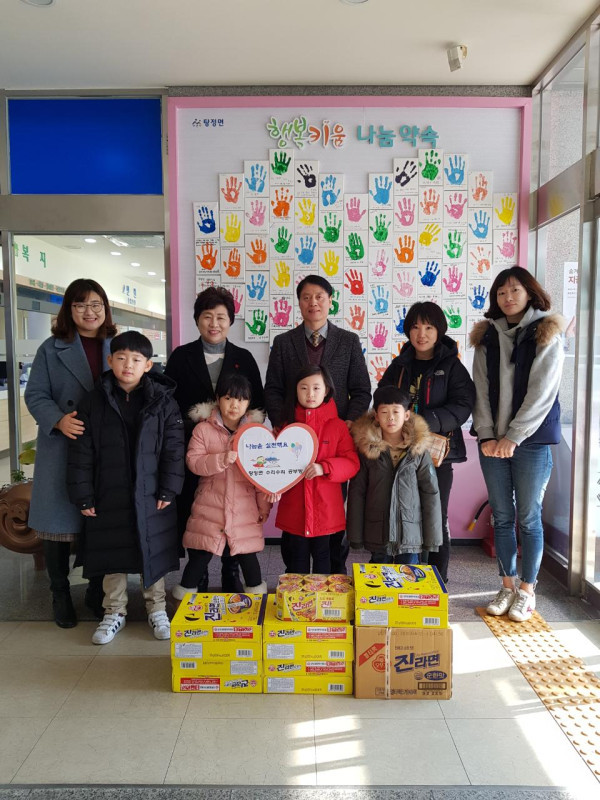 충남 아산시 탕정면 소재 수리수리 공부방은 공부방 아이들과 함께 7일 탕정면 행복키움추진단을 방문해 어려운 이웃을 위해 전달해 달라며 라면 6박스를 기탁했다. 사진은 기탁식에 참여한 관계자들이 기념촬영을 하는 모습. (사진제공=아산시청)