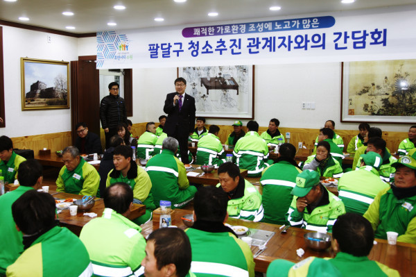 경기 수원시 팔달구는 8일 팔달구 소속 환경관리원, 청소차량 운전원 등 청소추진 관계자 90여명이 참석한 가운데 지역내 식당에서 ‘환경관리원 격려 조찬 간담회’를 개최했다. 사진은 행사에 참석한 이훈성 구청장이 환경관리원들에게 인사말을 하고 있는 모습. (사진제공=수원시청)