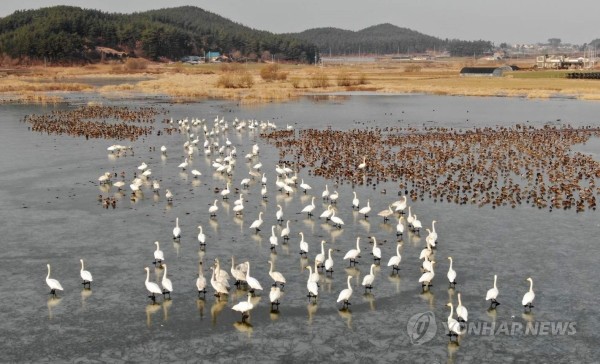 충남 태안군 근흥면 마금리 수룡저수지에 천연기념물(제201-2호)인 큰고니 100여마리가 찾아와 겨울을 나고 있다.