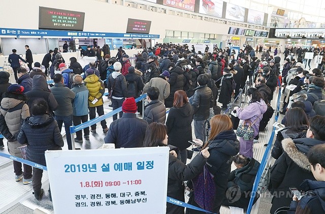 설 열차승차권 현장판매가 시작된 8일 오전 서울역에서 시민들이 열차표를 사기 위해 줄을 서 있다.