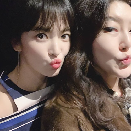 사진 속엔 송혜교와 함께 입을 쭉 내밀고 있는 한혜연이 있다. 둘은 비슷한 표정을 하며 귀여움을 뽐냈다. 특히, 한혜연과 송혜교는 무결점 피부를 드러내며 팬들의 감탄을 자아냈다.
