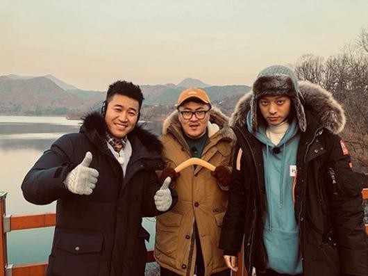 김종민은 양손으로 엄지를 치켜세우며 웃고 있고, 데프콘 또한 미소를 띠고 있는데 정준영만 다소 심각한 표정이어서 웃음을 안긴다.