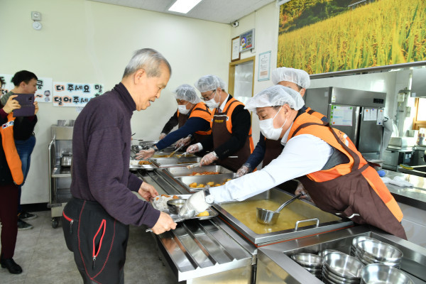 새해를 맞아 경기 양평군종합자원봉사센터는 지역사회 소외된 이웃을 위한 릴레이 자원봉사를 실시했다. 이날 첫 주자로 정동균 군수와 간부공무원들이 참석했다. 사진은 양평군장애인복지관에서 배식봉사를 하고 있는 정 군수와 공무원들의 모습. (사진제공=양평군청)