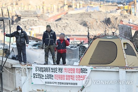 청량리4구역 연합비상대책위원회 관계자들이 13일 오후 서울 동대문구 청량리 제4구역 폐상가 건물 옥상에서 철거 보상 요구를 하며 시위를 하고 있다.