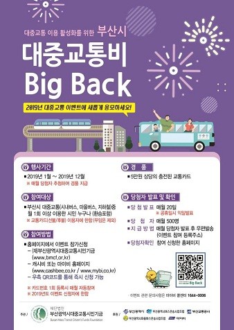 『2019년 부산시 대중교통비 BIG BACK』이벤트는 부산 대중교통(버스 또는 도시철도)을 한번이라도 이용하고, 이용한 교통카드 번호를 아래 홈페이지를 통해 등록하면, 추첨을 통해 매월 500명(연간 6,000명)에게 5만원 상당 충전교통카드(교통카드에 47천원 충전)를 등록한 주소지로 우편 배송해 주는 이벤트이다. ※ (재)부산광역시대중교통시민기금, 캐시비카드, 마이비카드