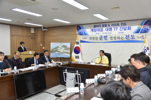 전남 진도군이 쏠비치 호텔&리조트 진도 개장과 관련해 예상되는 파급효과와 부서별 대응 방안 등 협업을 위해 국과소장 등 40여명이 대명 TF와 간담회를 개최했다. 사진은 간담회 진행 모습. (사진제공=진도군청)