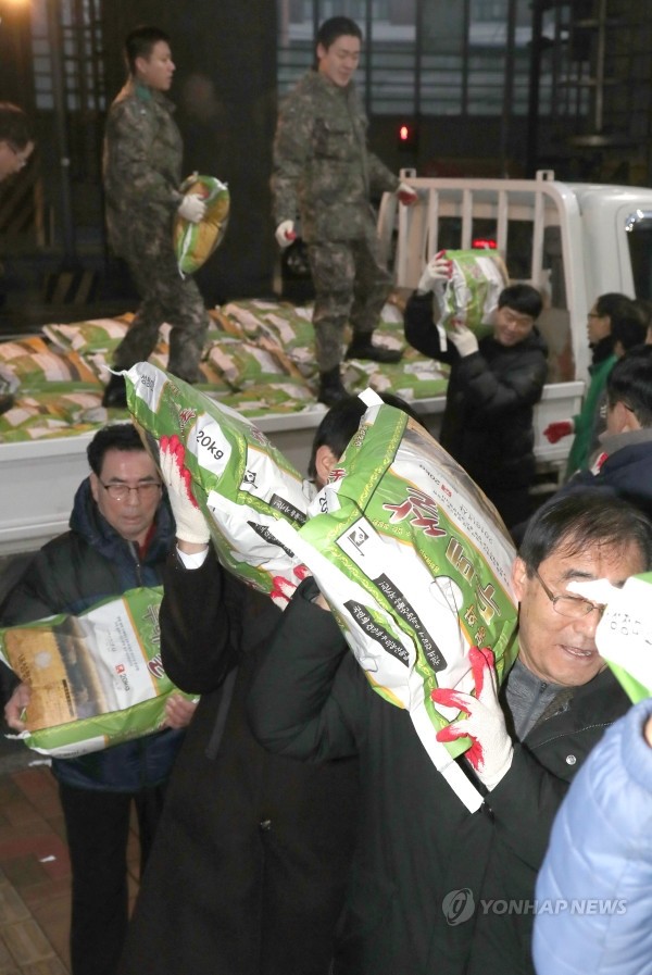 올해로 9년째 쌀 300포씩을 기증한 얼굴 없는 천사의 쌀이 도착한 14일 오전 서울 성북구 월곡2동 주민센터에서 주민, 공무원, 군인, 경찰이 함께 쌀을 내리고 있다.