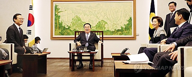 문희상 국회의장이 14일 국회에서 교섭단체 원내대표들과 회동하고 있다. 왼쪽부터 더불어민주당 홍영표, 문 의장, 자유한국당 나경원, 바른미래당 김관영 원내대표.