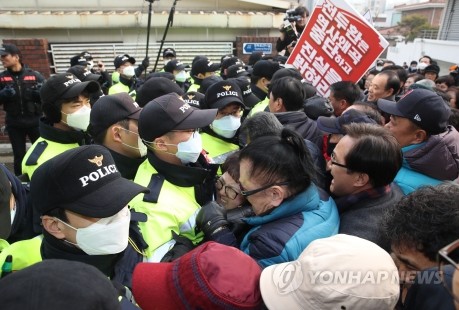 5·18기념재단과 3단체(유족회·부상자회·구속부상자회) 회원들이 14일 오후 서울 서대문구 연희동의 전두환 전 대통령 자택을 찾아 전 씨의 5·18민주화운동 희생자 명예훼손 관련 재판 출석을 요구하는 항의 시위를 펼치며 경찰과 몸싸움을 벌이고 있다.