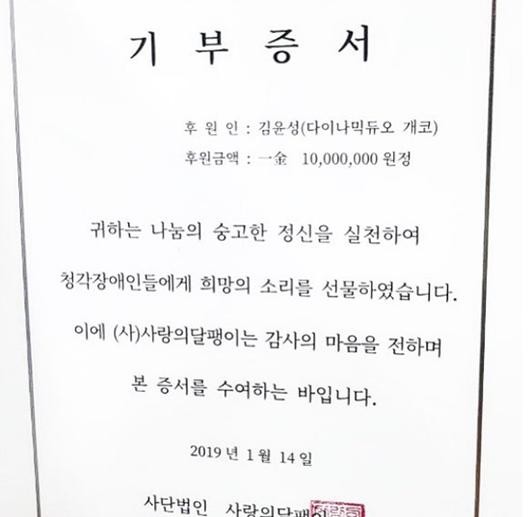 공개된 사진은 기부증서로, 개코는 사단법인 사랑의달팽이에 청각장애인들을 위한 1천만 원을 기부했다.