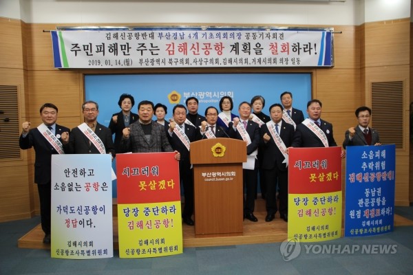 14일 오전 부산 연제구 부산시의회 브리핑룸에서 장인수 부산 사상구의회 의장, 정기수 북구의회 의장, 김형수 김해시의회 의장, 옥영문 거제시의회 의장 등 부산·김해 등 4개 구·군 의장과 일부 의원이 정부안으로 추진 중인 '김해 신공항 건설 계획 중단 기자회견'을 하고 있다.