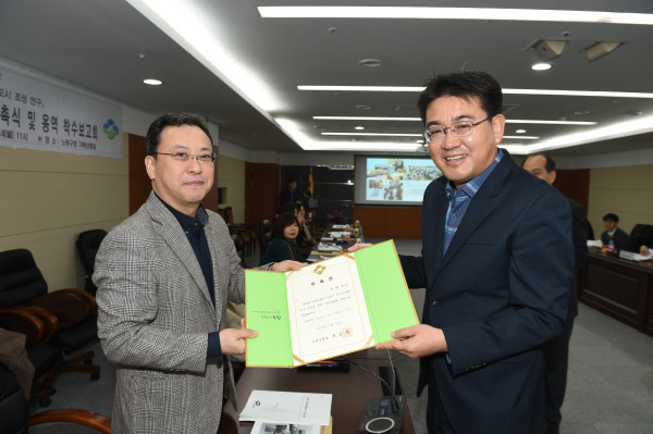 서울 노원구는 14일 오전 11시 구청 기획상황실에서 ‘어르신친화도시 자문위원회 위촉식’을 개최했다. 사진은 오승록 구청장이 자문위원회 위원에게 위촉장을 수여하고 있는 모습. (사진제공=노원구청)