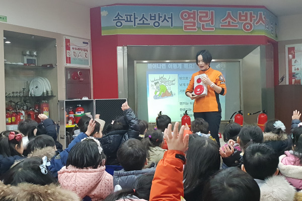 송파소방서는 16일 오전 소방서 3층 체험 교실에서 재미키즈 어린이집 원생을 대상으로 소방안전 교육을 실시했다. 이날 교육은 119 신고요령 안내, 물 소화기 체험, 화재 대피요령 등으로 진행됐다. 사진은 교육이 진행되는 모습. (사진제공=송파소방서)