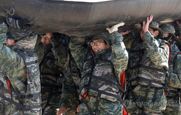 17일 경북 포항 도구해안에서 열린 겨울 해병대캠프에서 참가자들이 상륙용 고무보트(IBS) 탑승 및 기초훈련을 하고 있다.