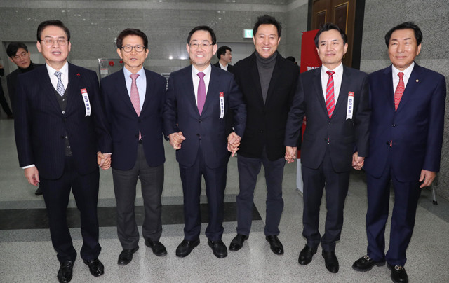 17일 오후 서울 여의도 중소기업중앙회에서 열린 자유한국당 3차 전국위원회 회의에서 당 대표자 후보군으로 떠오른 이들이 회의장 앞에서 손을 맞잡고 있다. 왼쪽부터 정우택 의원, 김문수 전 경기지사, 주호영 의원, 오세훈 전 서울시장, 김진태 의원. 오른쪽은 이날 임기가 끝나는 안상수 전국위원회 의장. /연합뉴스