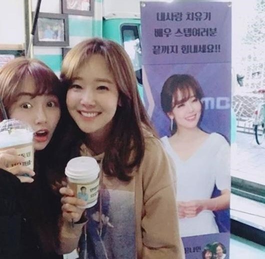 소유진은 16일 자신의 인스타그램에 "둘째 낳고 산후조리원에 있는 거 아니었니? 커피차라니...! 너무 고마워... 내 친구 나경이 열심히 촬영할게! 커피 마시러 내려온 상큼이 내 동생 이유도^^ 오늘 함께 화이팅하자!"라는 글과 함께 사진 두 장을 게재했다.