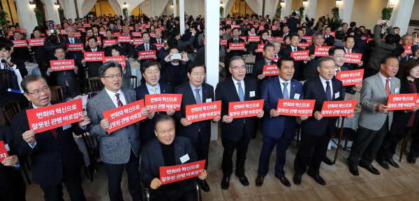 21일 대전 유성구 라도무스 아트센터에서 열린 전국 시·군·구의회 의장 협의회 정기총회에서 참석자들이 "변화와 혁신으로 잘못된 관행을 바로잡자" 손 피켓 퍼포먼스를 하고 있다. 협의회는 이날 외유성 해외 관광을 하지 않는다는 등의 내용을 담은 자정 결의를 했다.