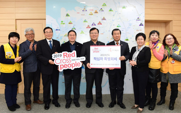 박덕순 경기 화성시 부시장이 최근 시청 접견실에서 대한적십자 경기도지사 김훈동 지사장을 만나 2019년 적십자 특별회비 100만원을 전달했다. 전달된 회비는 소외이웃의 구호활동에 쓰일 예정이다. 사진은 기념촬영을 하는 모습. (사진제공=화성시청)
