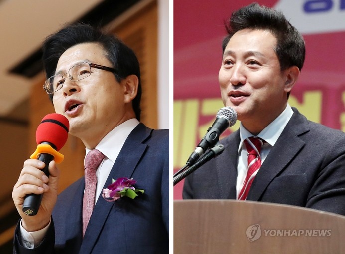 황교안 전 국무총리가 21일 오전 대구시 수성구 범어동에서 열린 여성정치아카데미 신년교례회에서 인사말을 하고 있다(왼쪽). 오세훈 전 서울시장도 이날 오후 경남 창원시 의창구 창원컨벤션센터에서 열린 ‘경남 경제 살리기 대토론회’에 참석해 인사말하고 있다.
