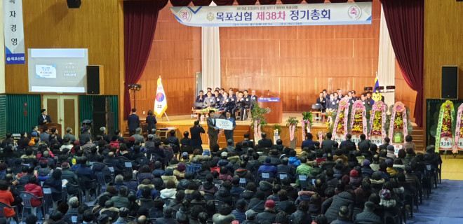 [목포=황승순 기자]목포신협이 지난 21일 목상고 인동관에서 김종식 목포시장을 비롯해 우기종 민주당 목포시위원장, 중앙회장,인근 전남목포·광주지역신협이사장, 조합원 등 800여명이 참석한 가운데 제38차 정기총회를 조합원 성원에 의해 개최하고 2018년도 감사보고서 및 결산보고서와 2019회계연도 사업계획 및 예산안 승인건 등의 부의안건을 처리하고 폐회했다. 사진은 박우영 이사장이 목상고 장학금을 전달하는 모습.